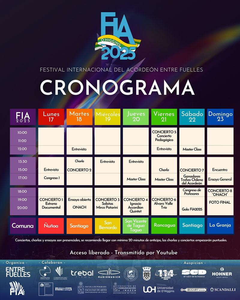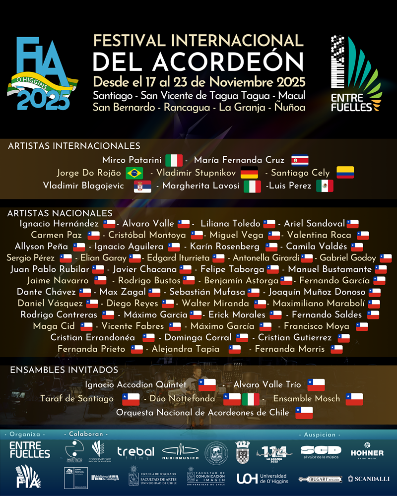 El Festival Internacional del Acordeón (FIA) vuelve entre el 17 y el 23 de noviembre con su séptima versión, un recorrido cultural que llegará a las regiones de O’Higgins y Metropolitana con actividades gratuitas para todo público. Conciertos, talleres, masterclass, workshops y un gran concierto final darán forma a una semana dedicada a celebrar el acordeón y su vigencia en la música chilena y latinoamericana.
