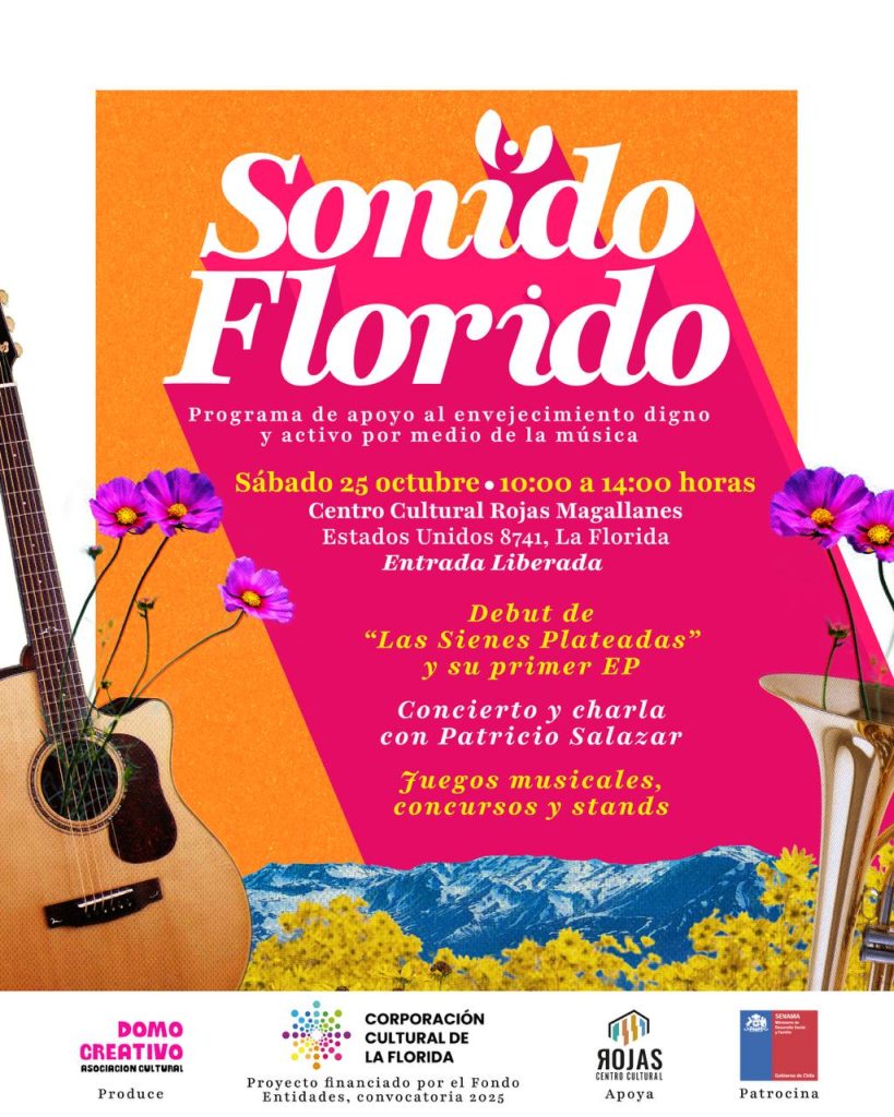 El próximo sábado 25 de octubre, el Centro Cultural Rojas Magallanes será escenario del evento de cierre del innovador programa de formación artística “Sonido Florido” impulsado por la asociación Domo Creativo, que tendrá como gran número la presentación del conjunto Las Sienes Plateadas. El proyecto es financiado por el Fondo de Entidades Culturales de la Corporación Cultural de La Florida, Convocatoria 2025.