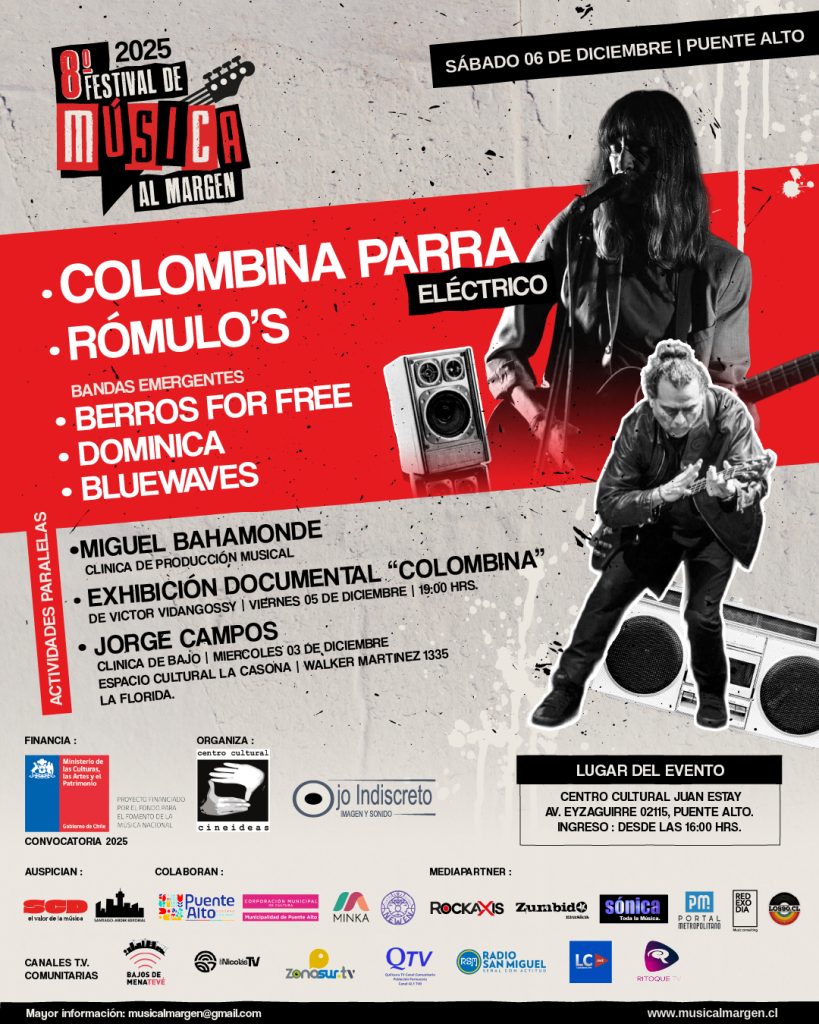 La octava edición de Música al Margen, encuentro que celebra la música independiente, tiene como headliners a Colombina Parra Eléctrico, el bajista Jorge Campos, el ingeniero en sonido Miguel Bahamonde y la banda puentealtina RÓMULO´S. El evento que se realizará en Puente Alto desde el 3 al 6 de diciembre, cuenta con el apoyo de la Municipalidad de Puente Alto y su Corporación Cultural.